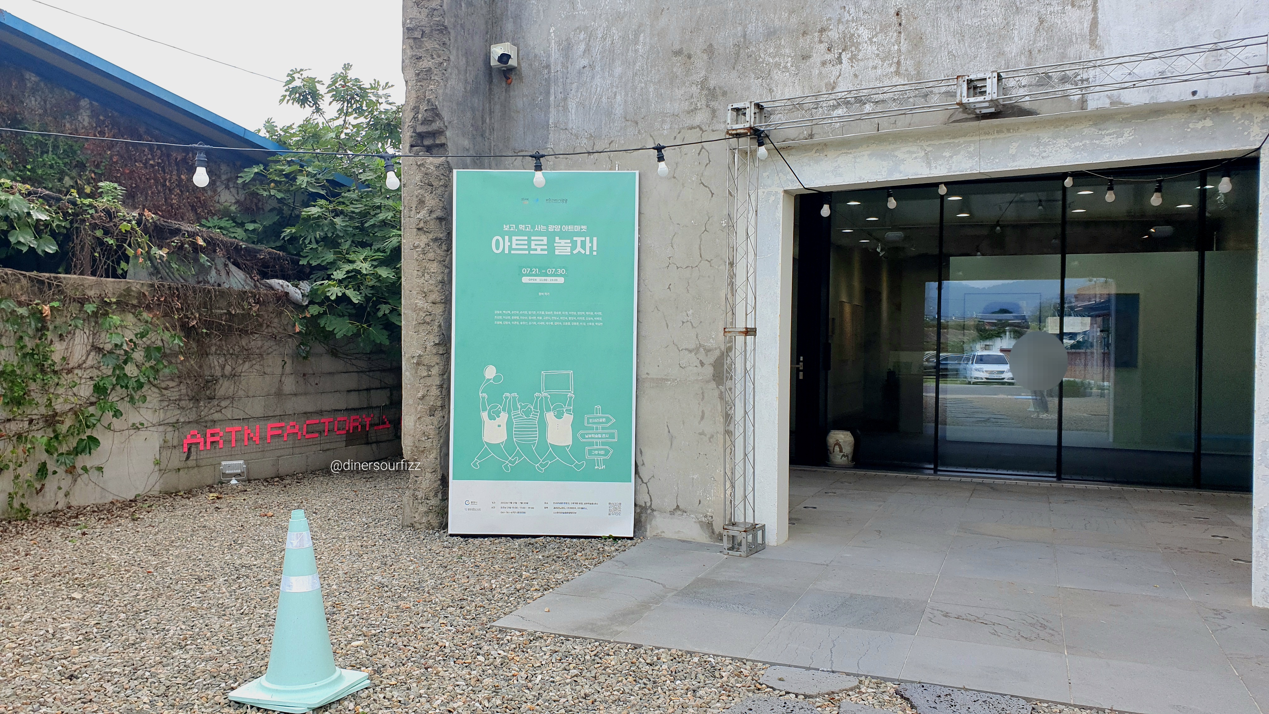입구 앞에 놓인 민트색 라바콘이 인상적이다.