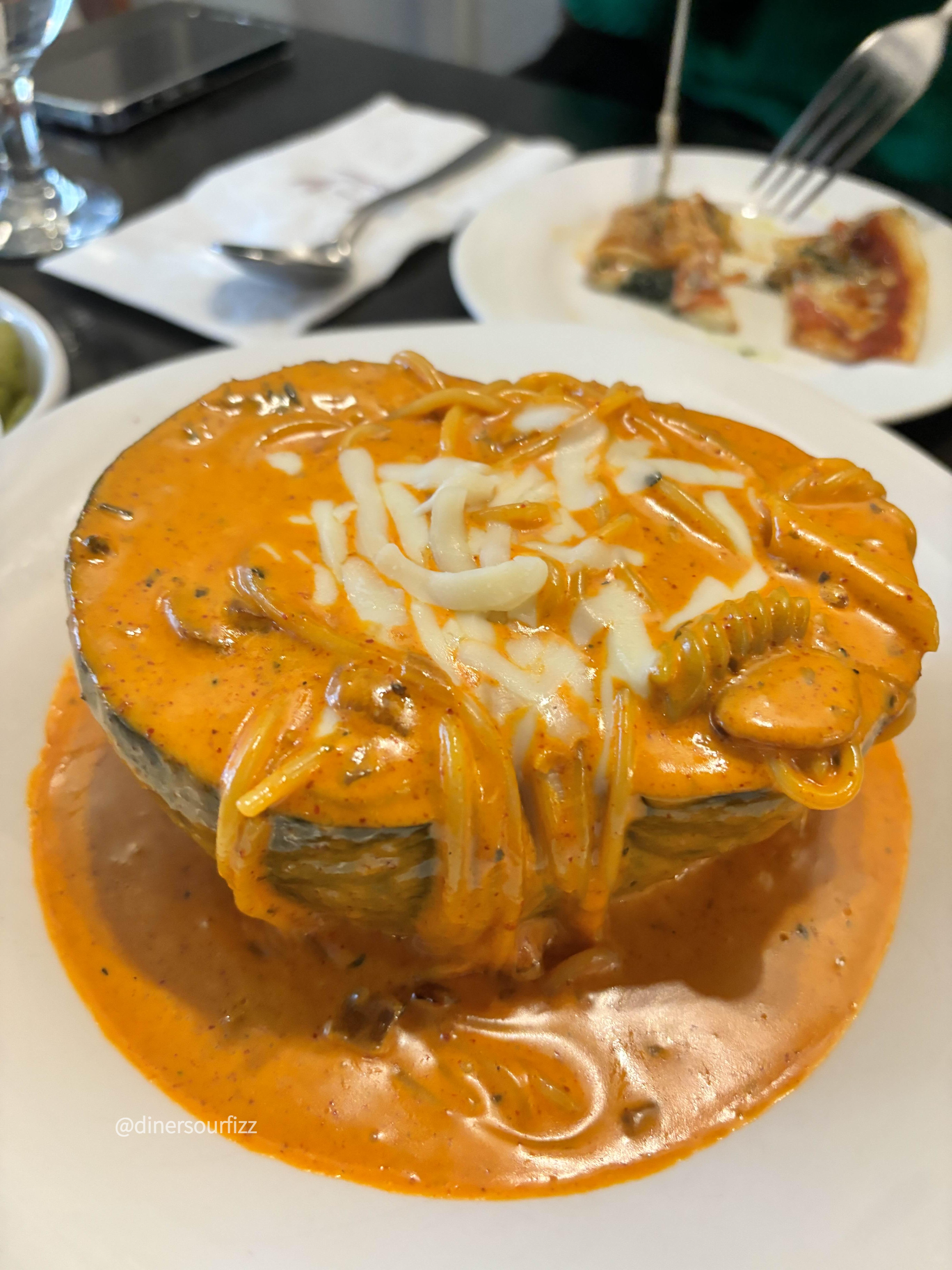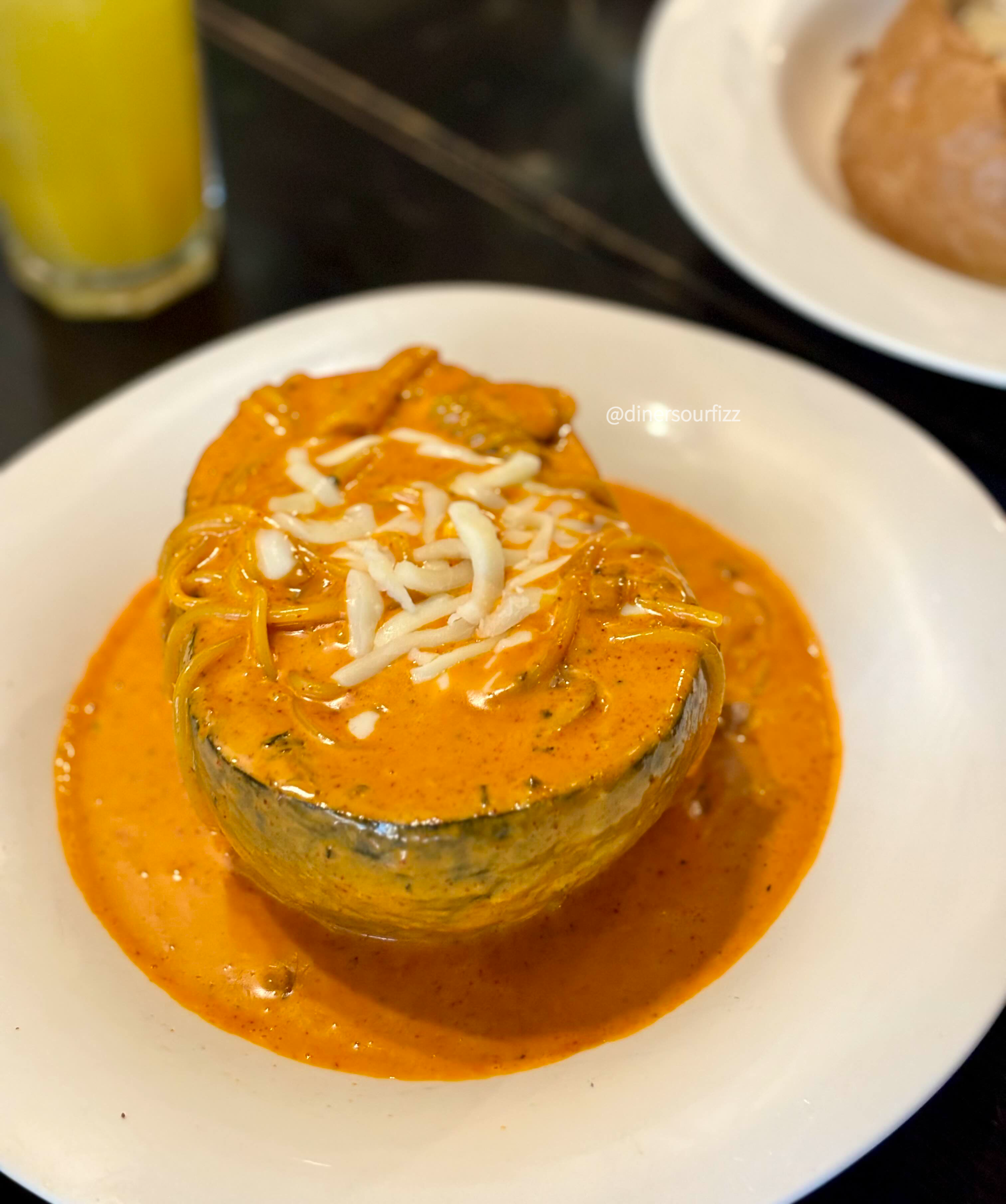 단호박 반쪽의 속을 파서 안에 파스타를 넣었다.