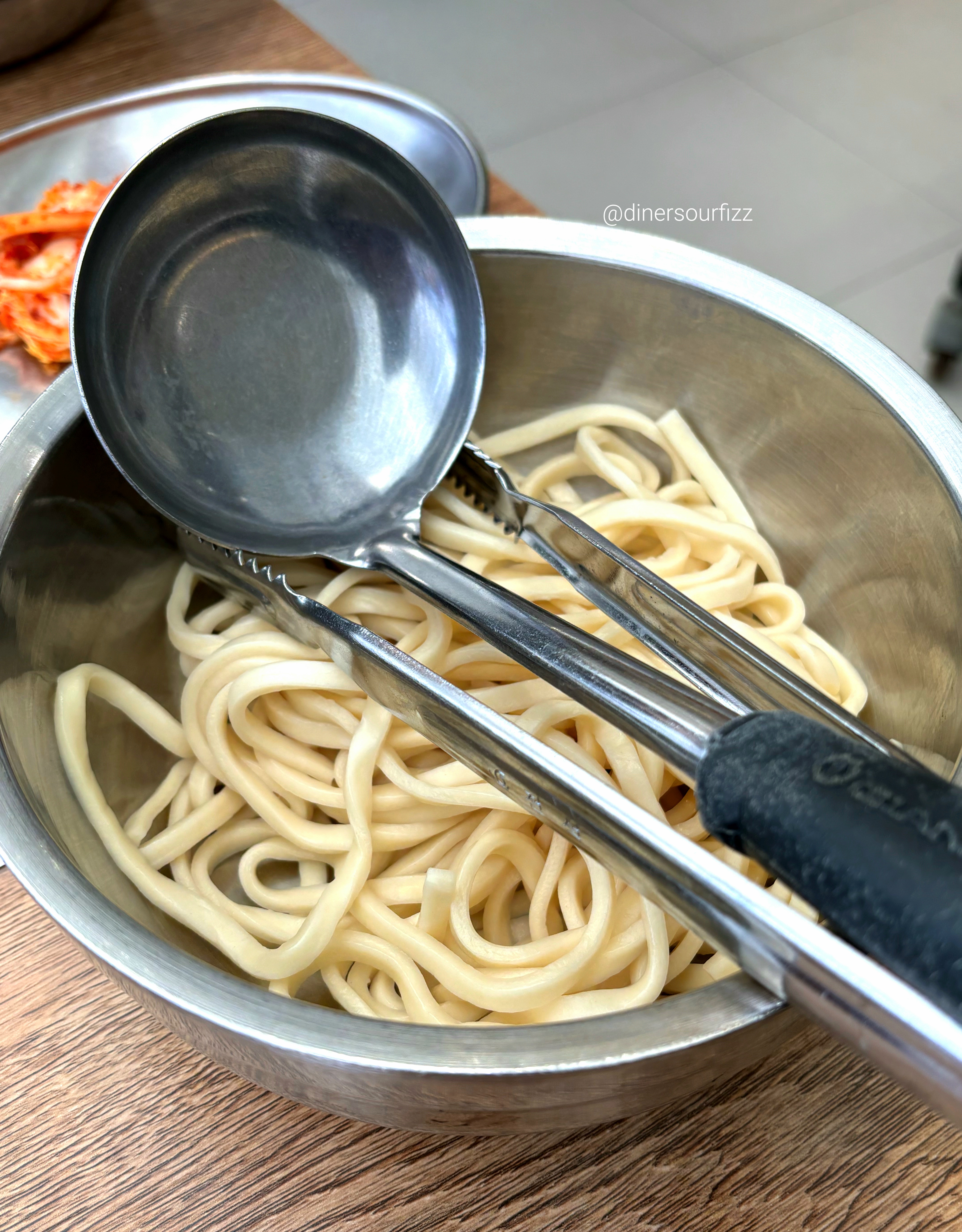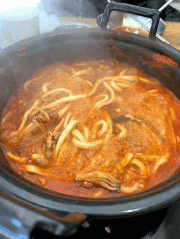 좀 먹었다 싶으면 칼국수면을 넣어 팔팔 끓여준다.